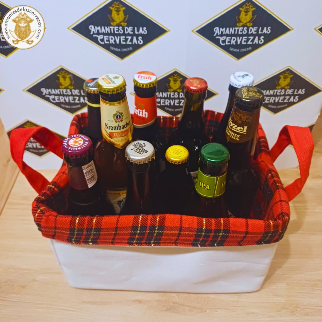 Contiene 10 CERVEZAS INTERNACIONALES DIFERENTES, DENTRO DE UNA CESTA DE TELA DECORADA PARA ESTAS FIESTAS Y UN FOLLETO INFORMATIVO de los distintos estilos de Cervezas que existen y a cuál pertenecen las Cervezas del Pack.