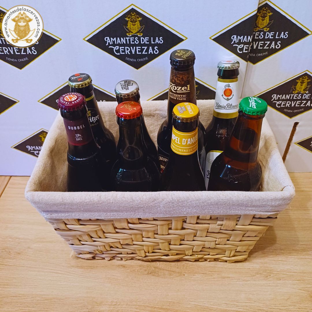 Contiene 8 CERVEZAS INTERNACIONALES DIFERENTES, DENTRO DE UNA CESTA ORIGINAL CON TRENZADO DE JUNCO Y TELA DE LINO, Y UN FOLLETO INFORMATIVO de los distintos estilos de Cervezas que existen y a cuál pertenecen las Cervezas del Pack.